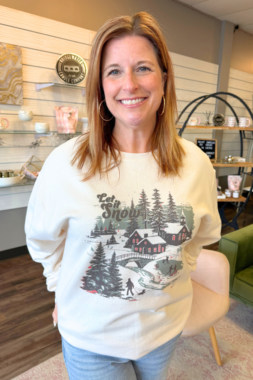 Wrap yourself in cozy nostalgia with this charming Let It Snow sweatshirt. Featuring whimsical vintage-inspired design on soft cream fabric, it's the perfect blend of retro charm and modern comfort. Whether you're sipping cocoa by the fireplace or strolling through winter wonderland moments, this sweatshirt brings playful spirit to your everyday wardrobe. A timeless piece that feels like a warm hug from the past.