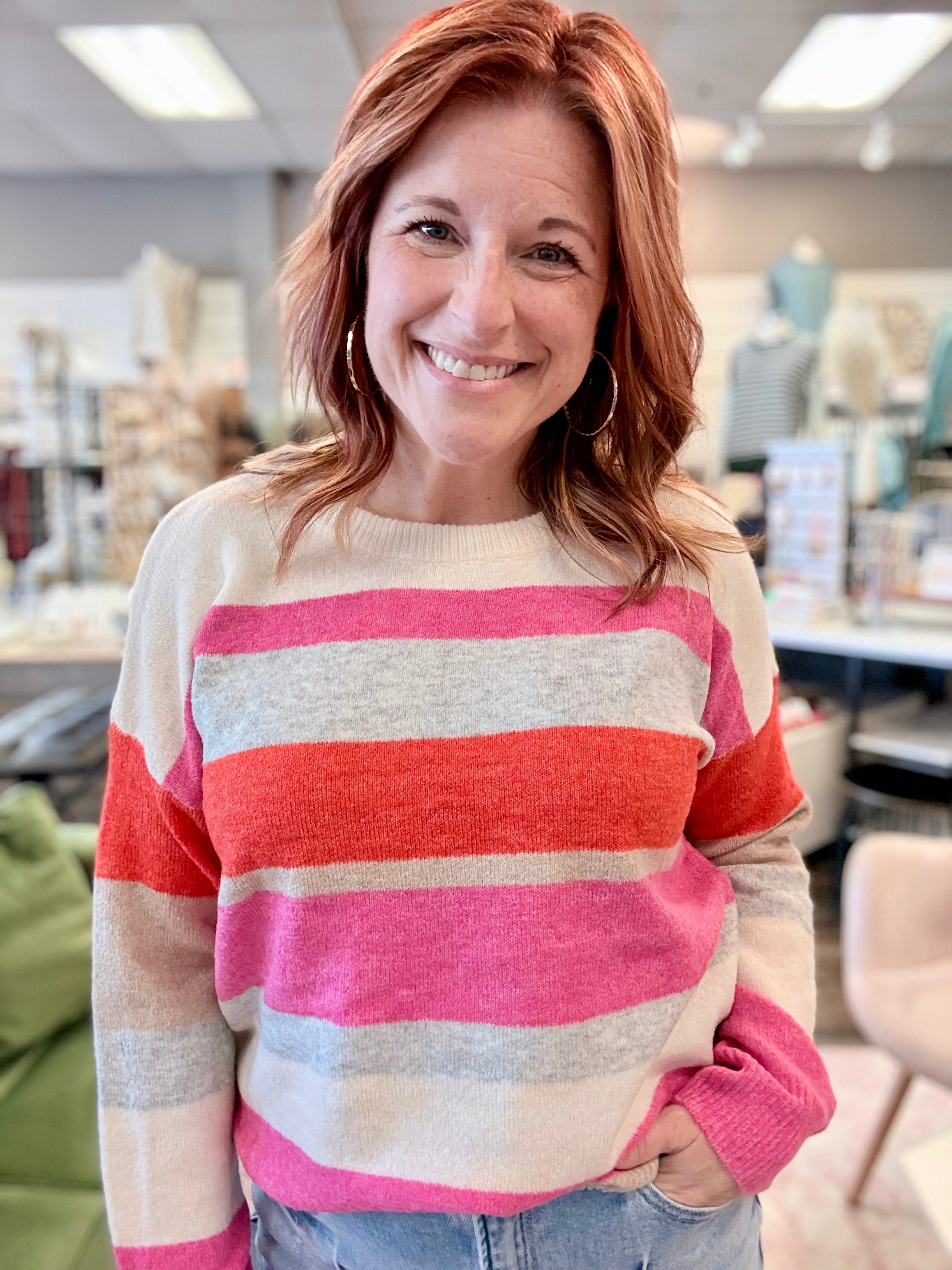 Liven up your wardrobe with this Pink and Orange Striped Sweater. Its bright, bold stripes bring a joyful splash of color that instantly lifts any outfit. Cozy and soft, it’s perfect for staying warm while showing off your fun and spirited style on the go.